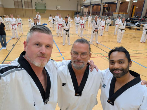 Prüfer Großmeister Song, Chan-Ho, 9. Dan, Großmeister Dr. Joswin Kattoor, 6. Dan, Großmeister Hubertus Gnegel, 7. Dan.